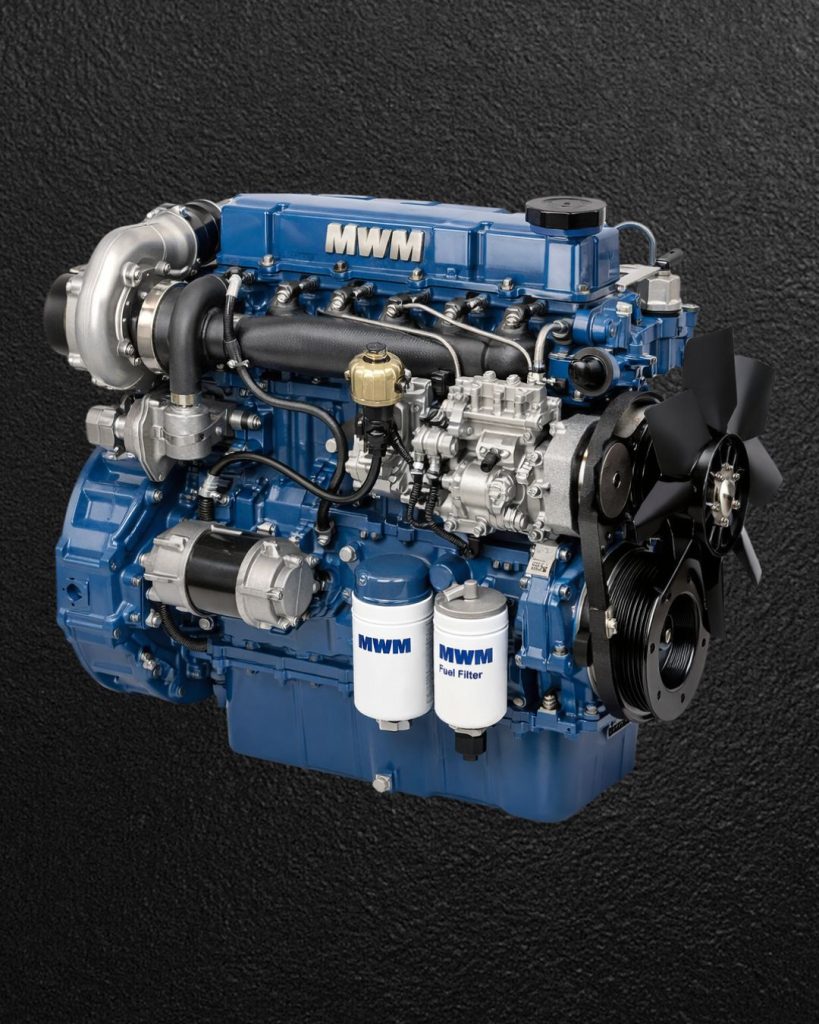 Grupos geradores equipados com motor MWM a diesel, potências de 40 a 180 KVA. Rotação nominal de 1800 rpm, refrigeração à água com radiador, partida elétrica 12 Vcc, painel local com termômetro, manômetro e horímetro. Proteção automática por baixa pressão de óleo e alta temperatura da água.